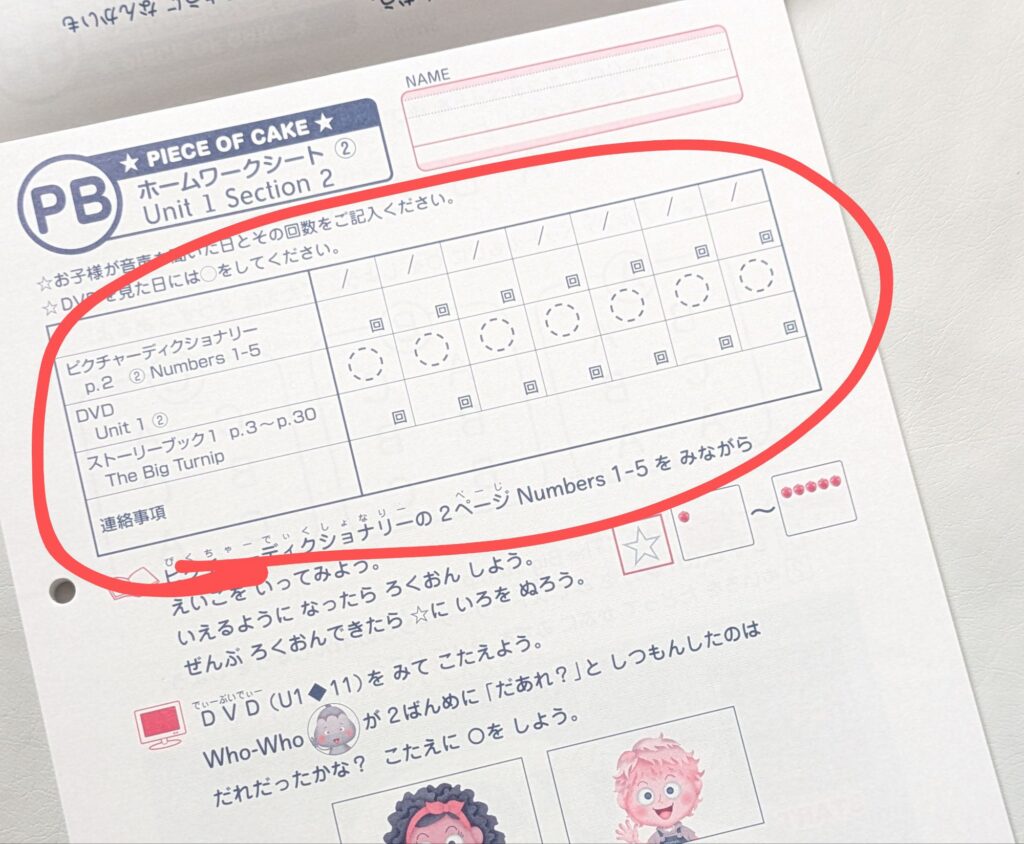 ホームワークシート上部には、いつ何を何回取り組んだのかを記入する欄がありますので