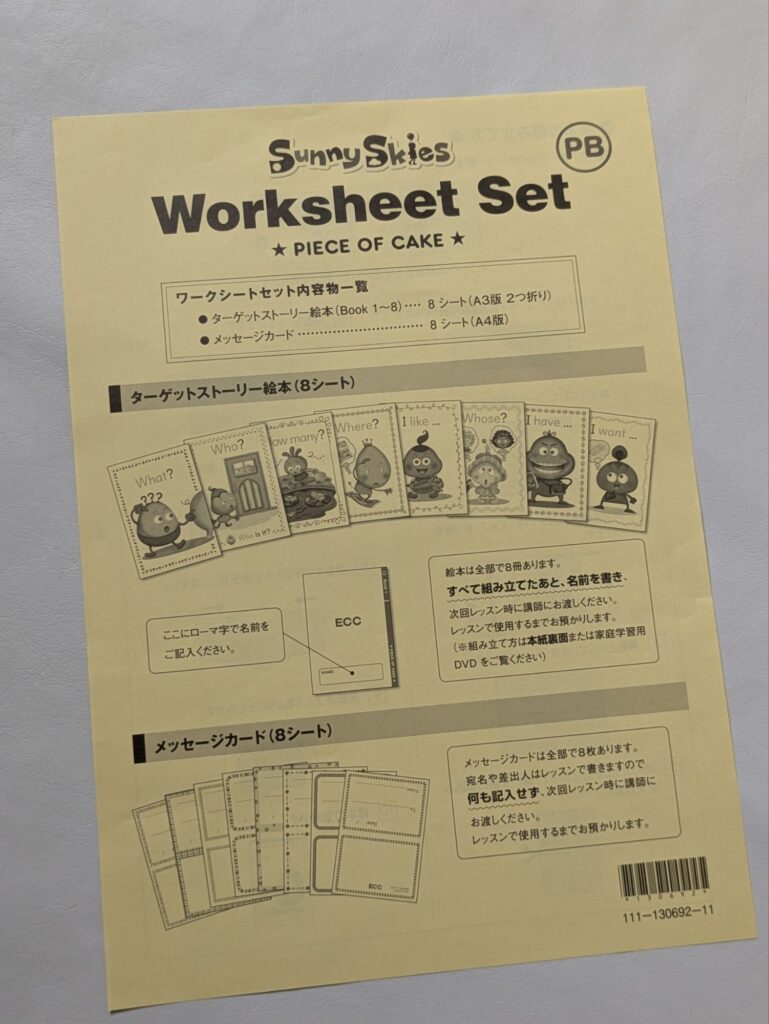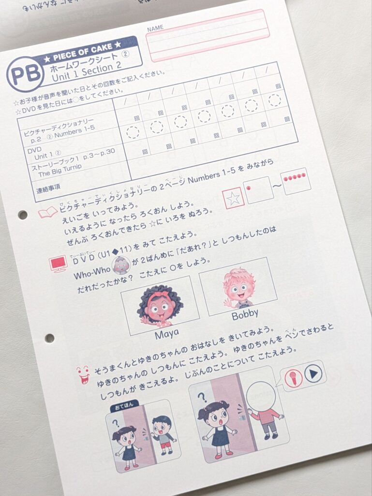 毎週1枚、写真のような宿題が出ます(レッスン後に先生から個人にホームワークシートが配布されます)✳毎週内容は異なる。
