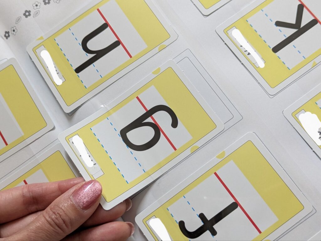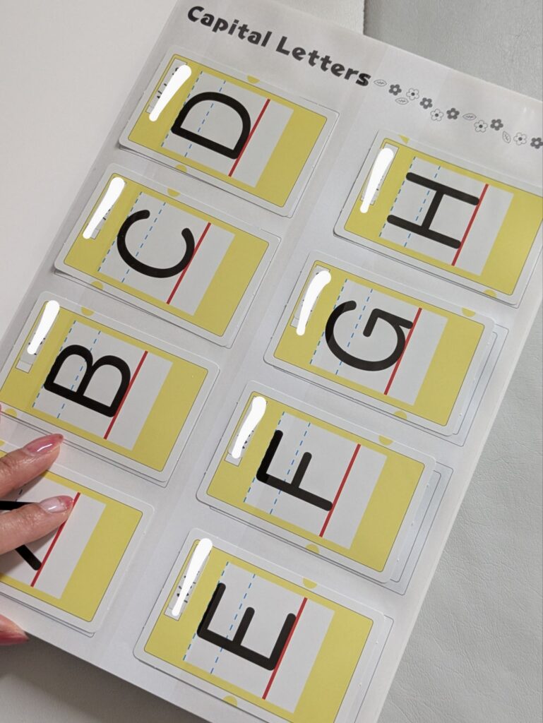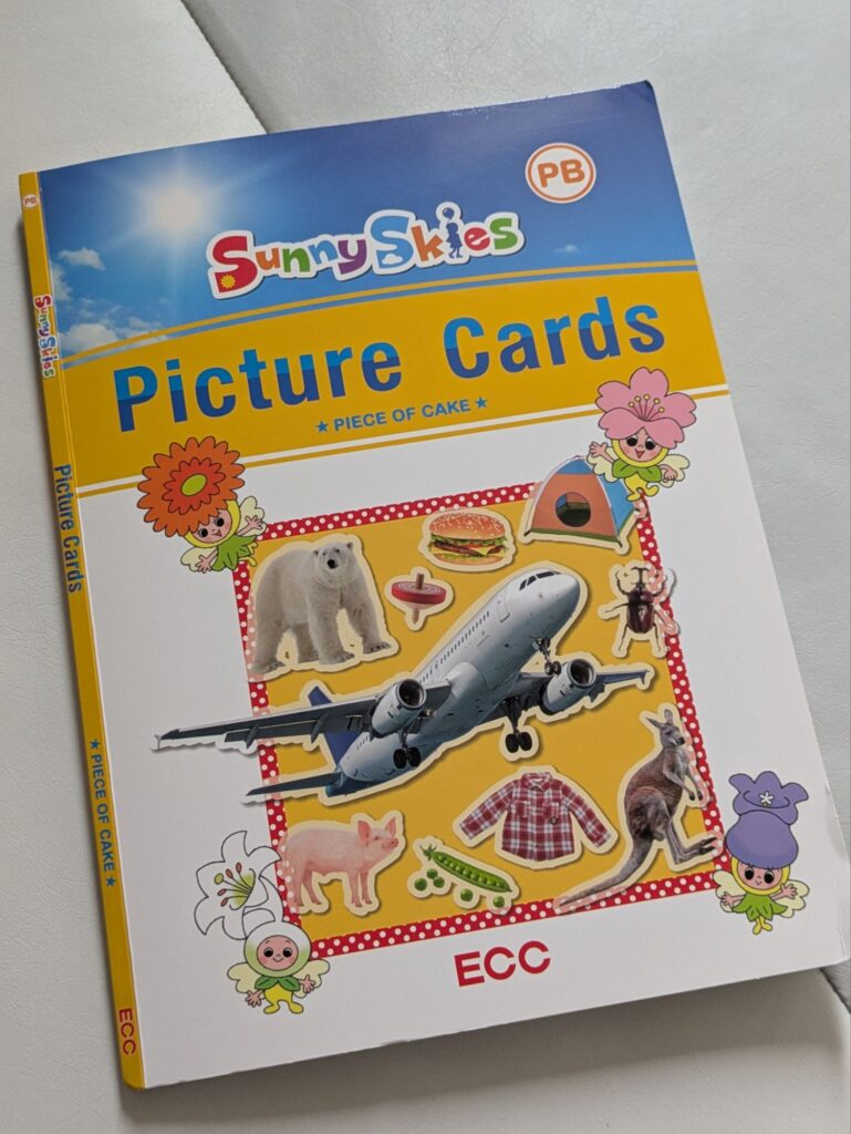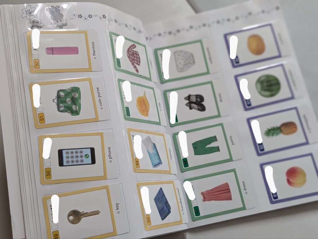 ピクチャーカードは約250枚程あり、初めはカードがすべて台紙につながった状態になっています。次のレッスンまでに、台紙からすべてのカードを切り取り、一部を除くすべてに名前を記入します。※自分の物だと分かれば、印を付けるのみでもOK!