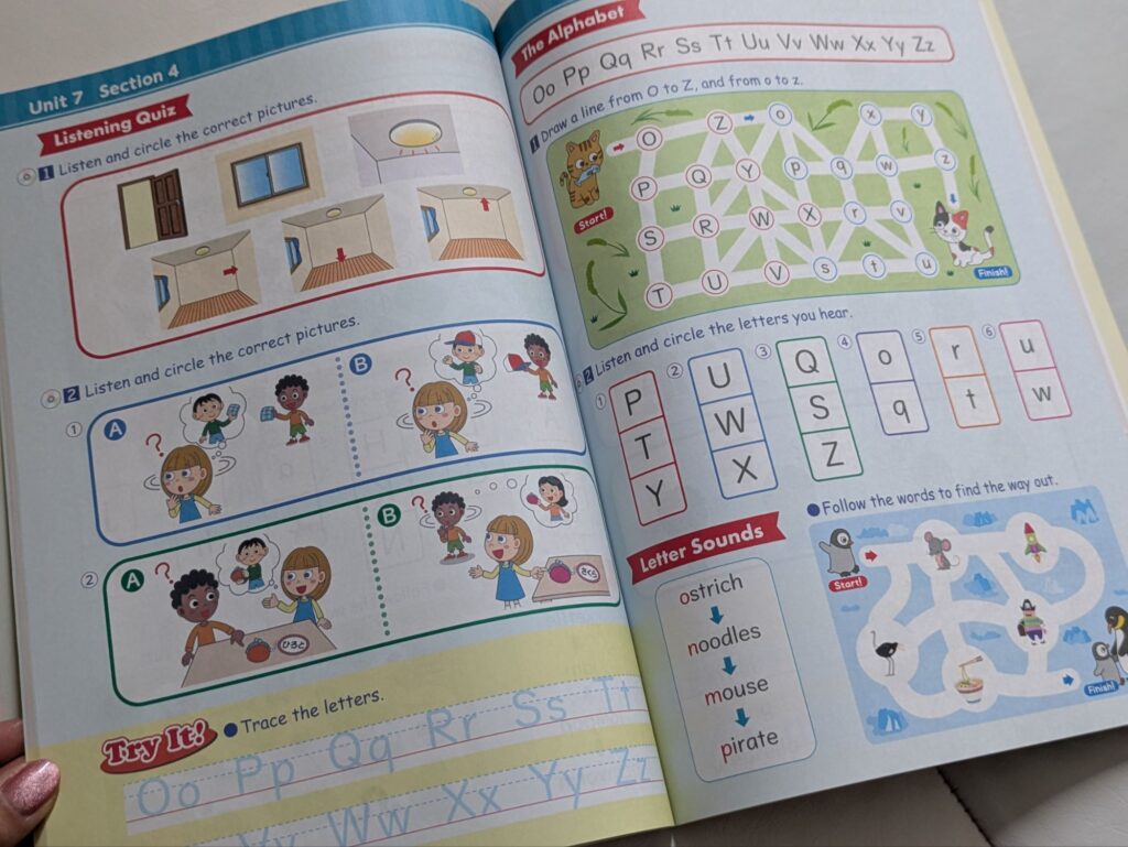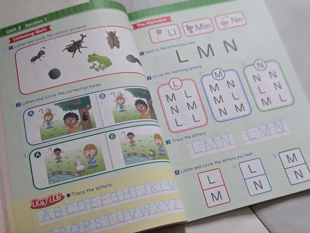レッスンでは基本的にこちらのテキストを中心に使用します。アルファベットや、英単語、レッスンで習うフレーズの聞き取り問題等があります。