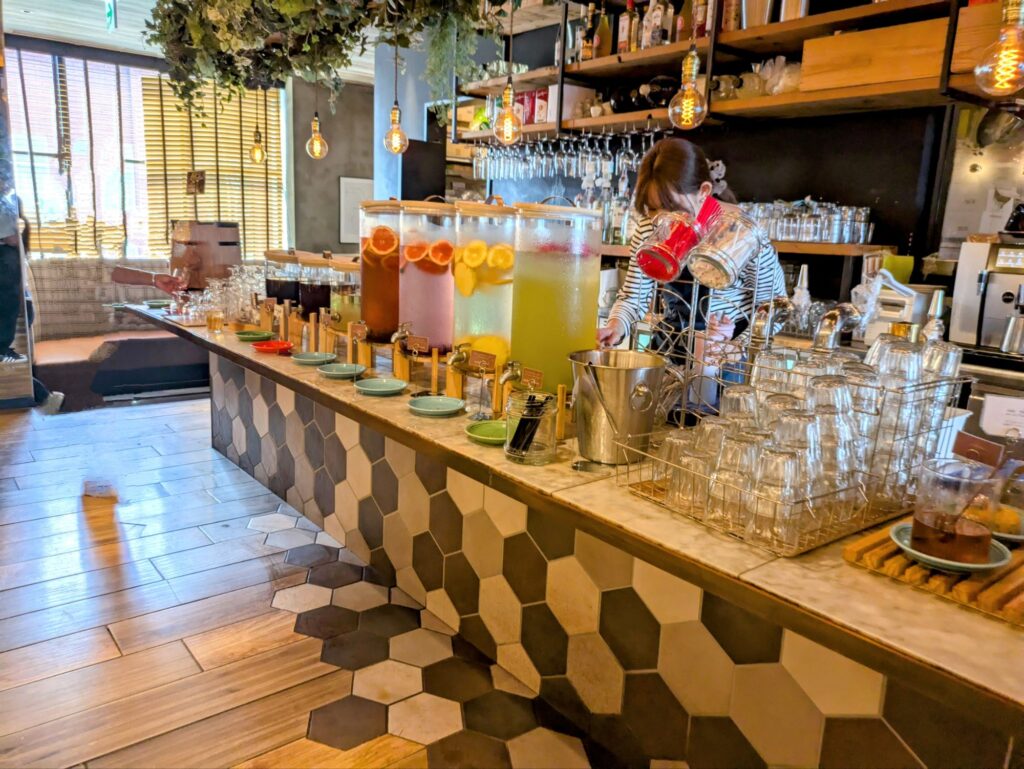 デトックスウォーター、アイスコーヒー、アップルジュース、ワイン、紅茶、ホットコーヒー