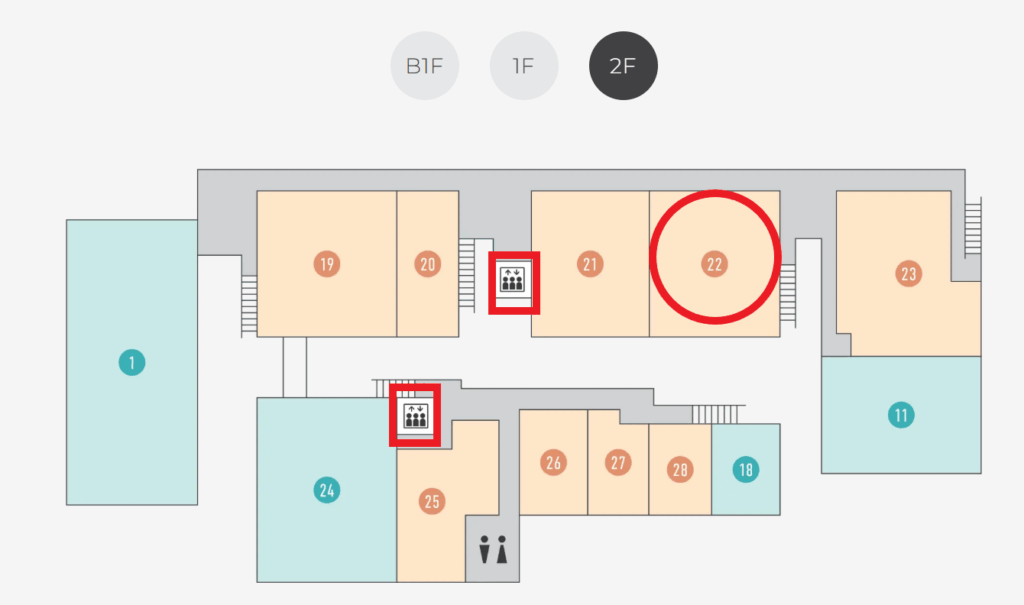 お店は、以下の写真の㉒の場所で、みなとみらいのマリン&ウォーク2階にあります。