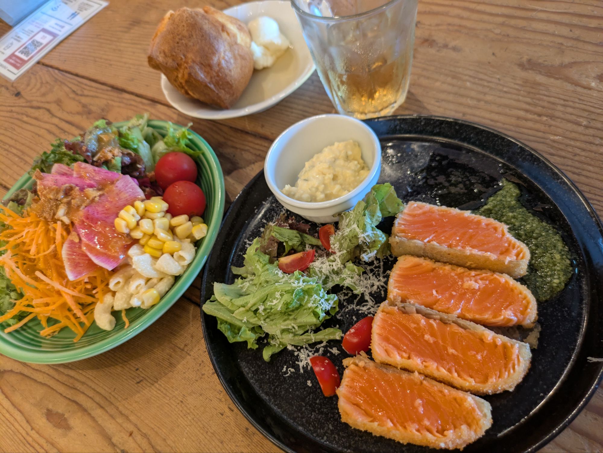 サラダバーは大混雑で、撮影できなかったのですが、種類は豊富でしたし、ドレッシングやフライドオニオン等のトッピングも数種類あったと思います!