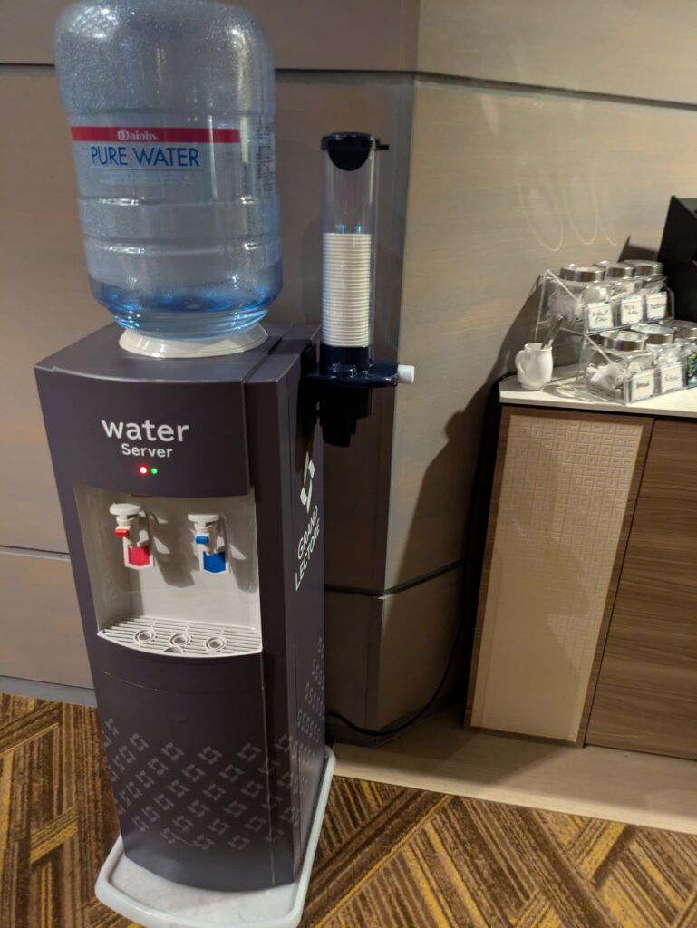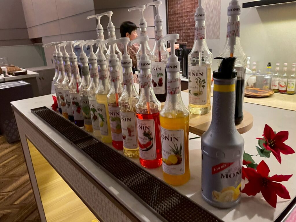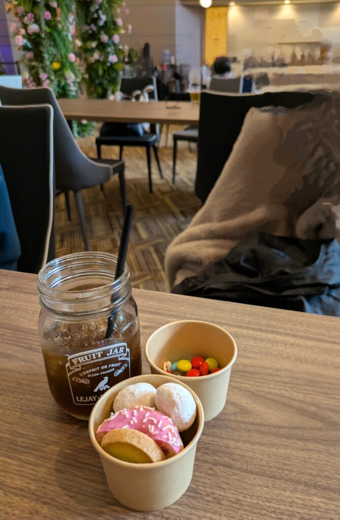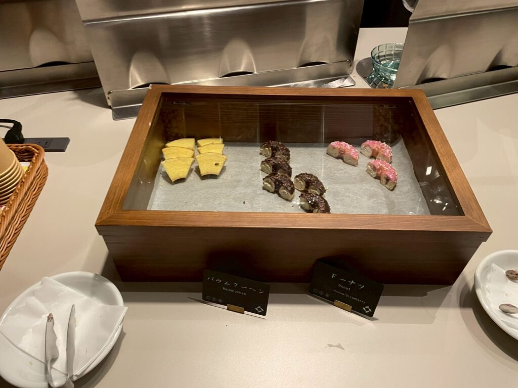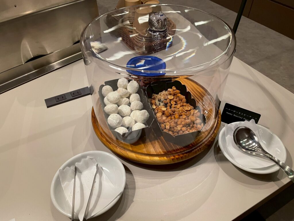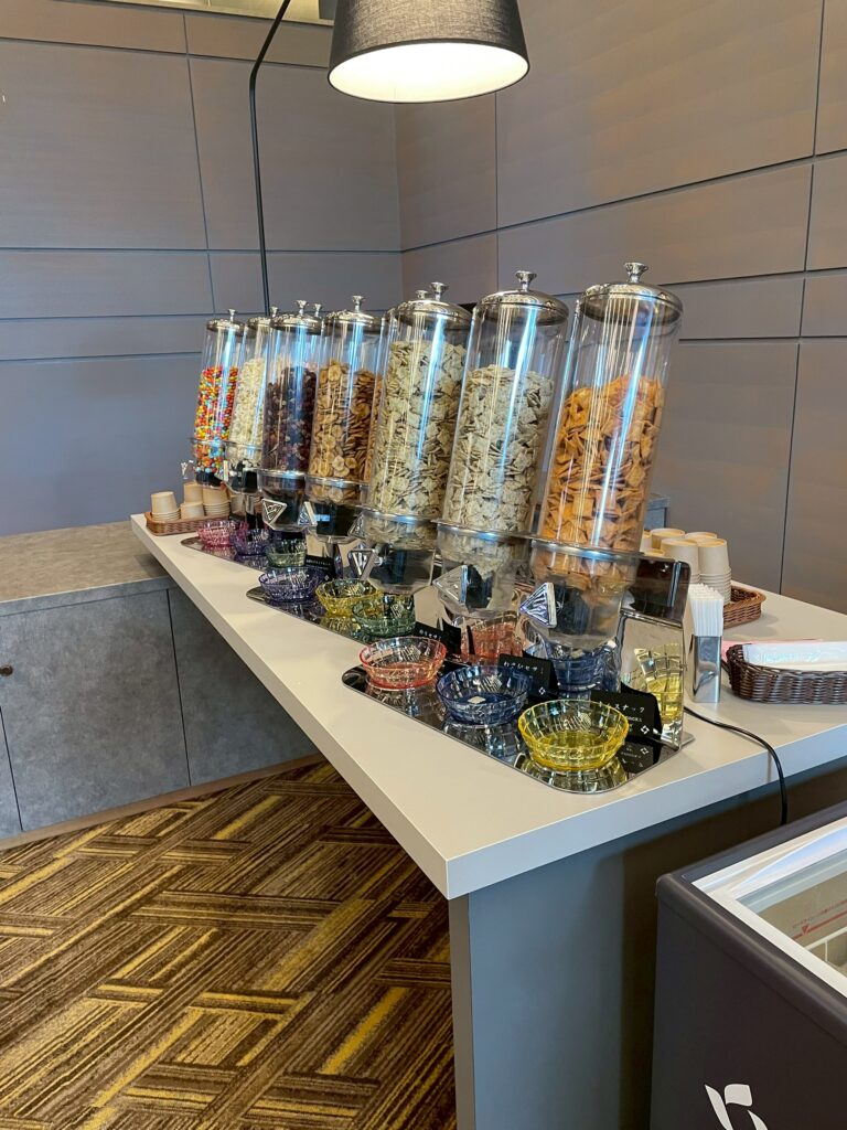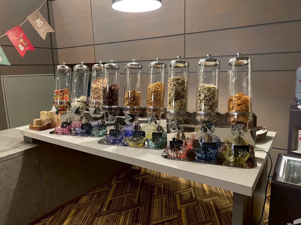 メインラウンジは、午後は混みあっていて写真が撮りにくかったので、夜撮影した写真もありますが、基本的には置いてあるお菓子類やドリンク類は、ずっと同じものでした!