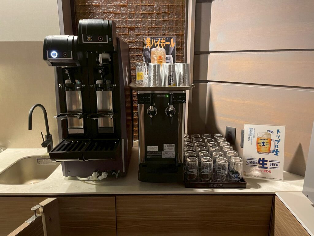このメインラウンジにて、多数のお菓子やアルコール含むドリンクを、上記営業時間内はいつでも無料で飲食可能です!