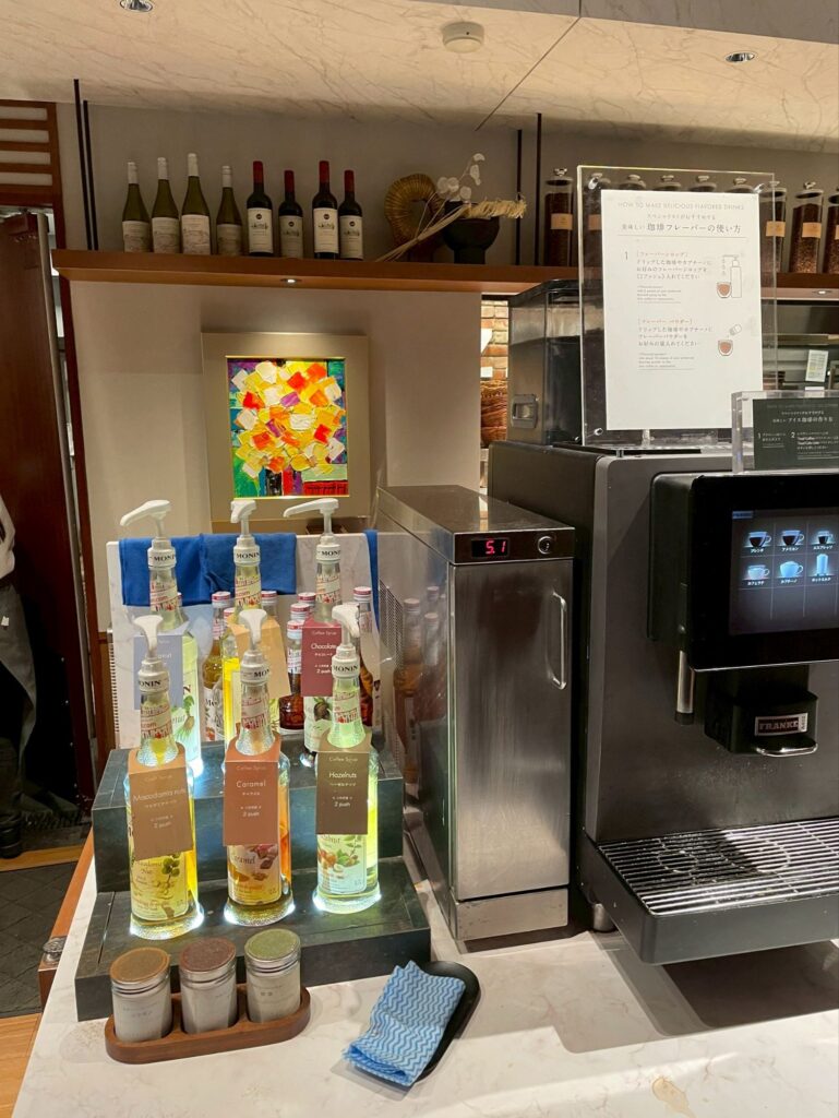 マシンでコーヒーやラテなどを作ったら、6種類のフレーバーシロップや3種類のパウダーを入れることによって、オリジナルのコーヒーを楽しめます^^