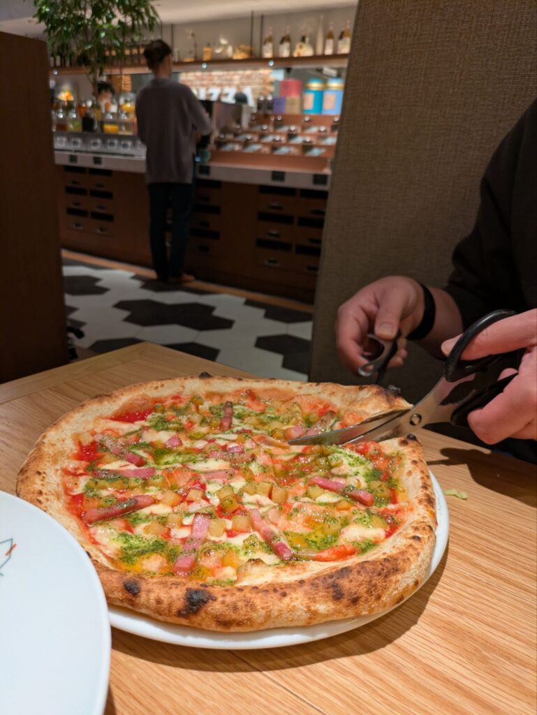 ピザは、ハサミが付いてくるので、ジョキジョキ切っていただきました!