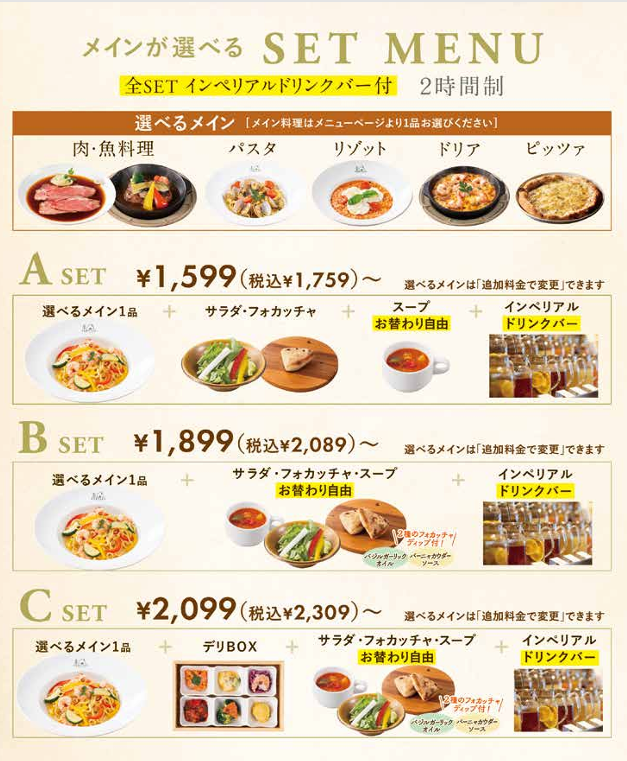 いずれも「サラダ食べ放題」「フォカッチャ食べ放題」「スープ飲み放題」「ドリンク飲み放題」を付けられ、Cセットにおいては、更にデリBOXが付きます!