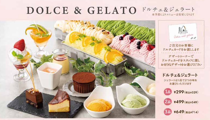 デザートメニューは、ドルチェやジェラートを選べて、以下の通り品数によって価格が変わります。