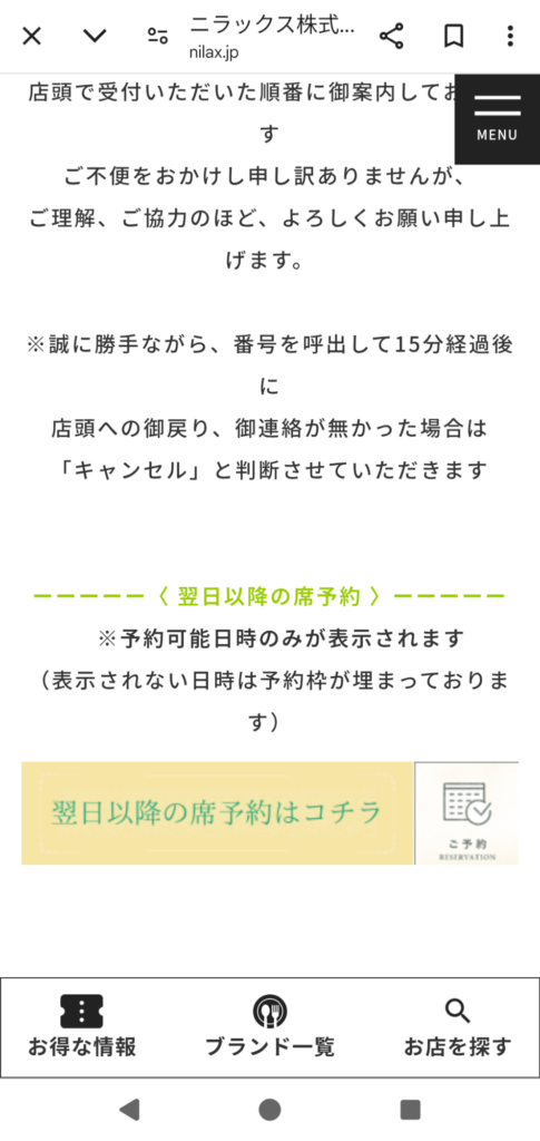 ⑤画面下部の『翌日以降の席予約はコチラ』を選択
