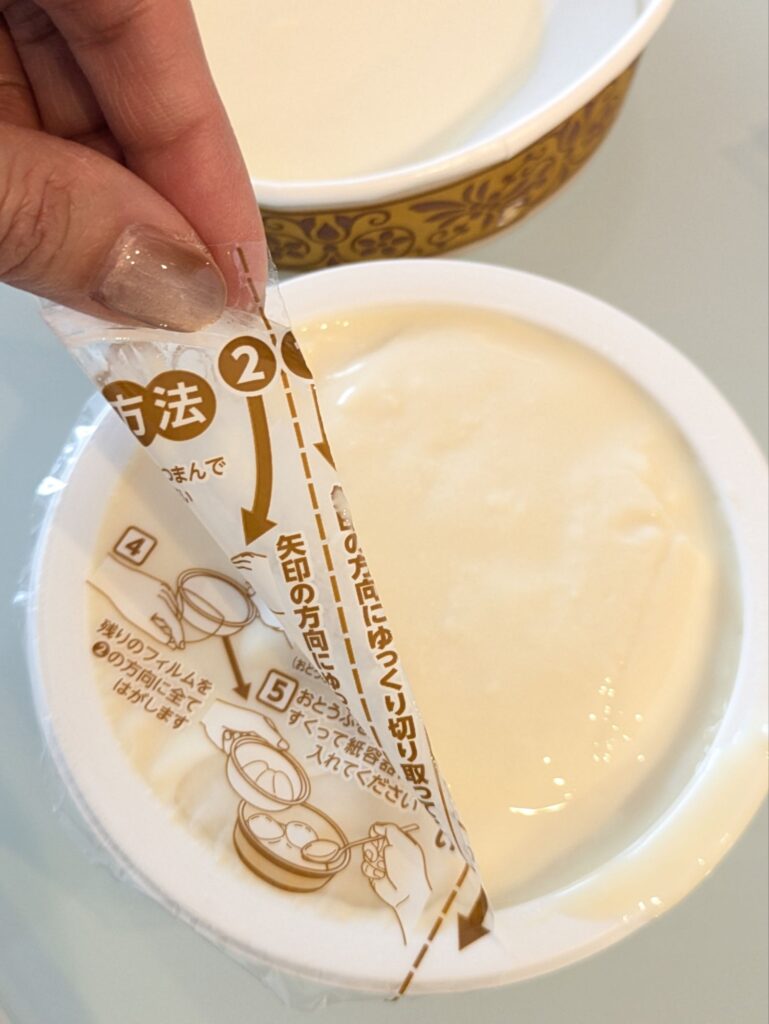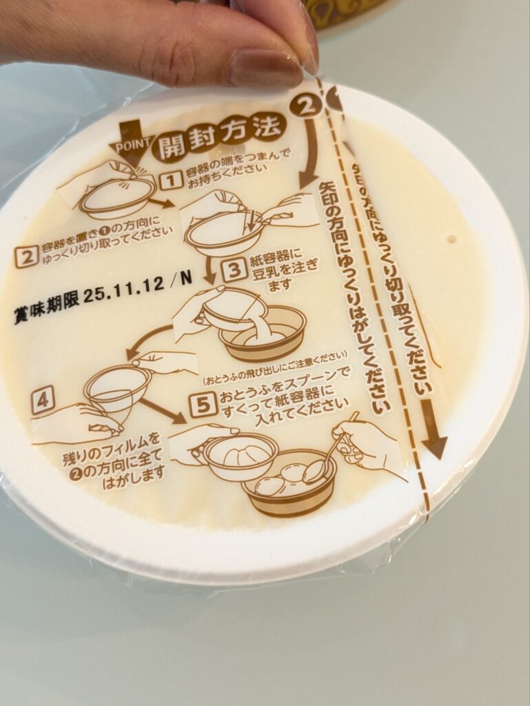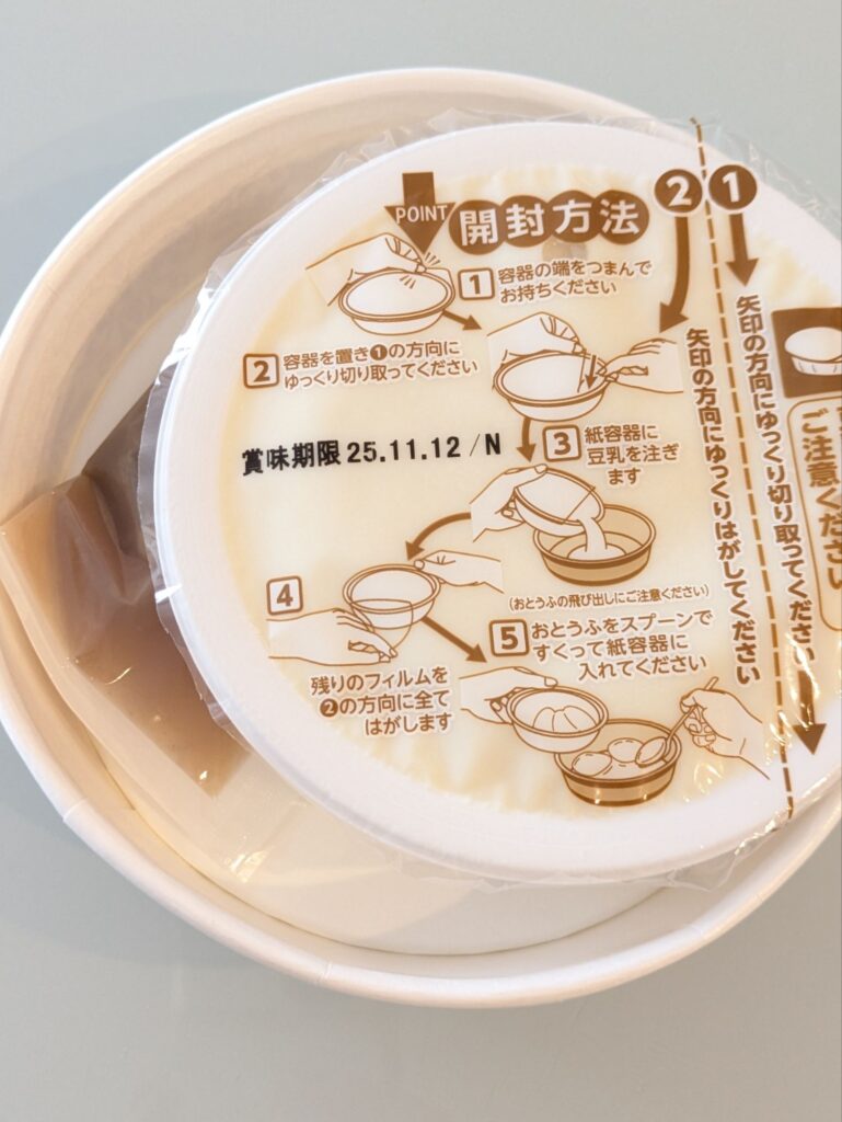 ②をはがしたら、紙の容器にとうふを全部挿入します。