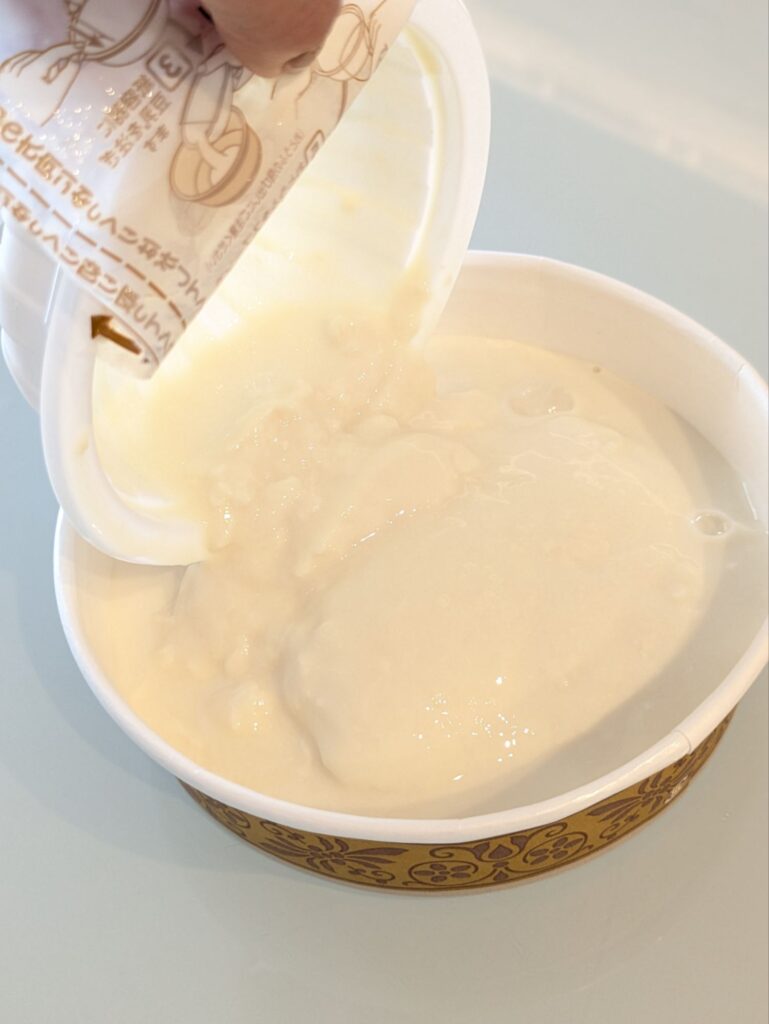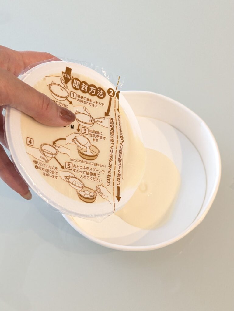 その後、切り取った部分から、紙の容器に豆乳を注ぎます。